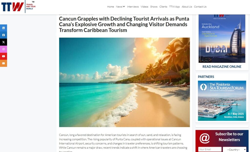 Cancún ha visto una disminución en sus arribos internacionales, debido a las dificultades sufridas por pasajeros en su aeropuerto, sumado a la fuerte competencia de Punta Cana, advierte la revista internacional “Travel and Tour World”, especializado en este mercado y en eventos turísticos. En una publicación en su página web, esta revista, que señala tener […]