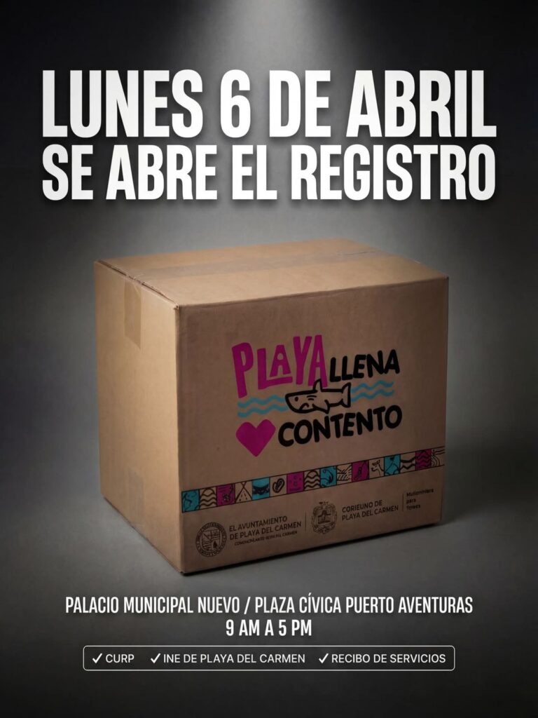 La convocatoria -explicó- abrirá este lunes 6 de abril, en horario de 9:00 de la mañana a 5:00 de la tarde, con módulos de registro habilitados en dos puntos estratégicos: la Secretaría de Justicia Social y Participación Ciudadana, en Playa del Carmen, y la Plaza Cívica de Puerto Aventuras, con el fin de facilitar el acceso a más familias.