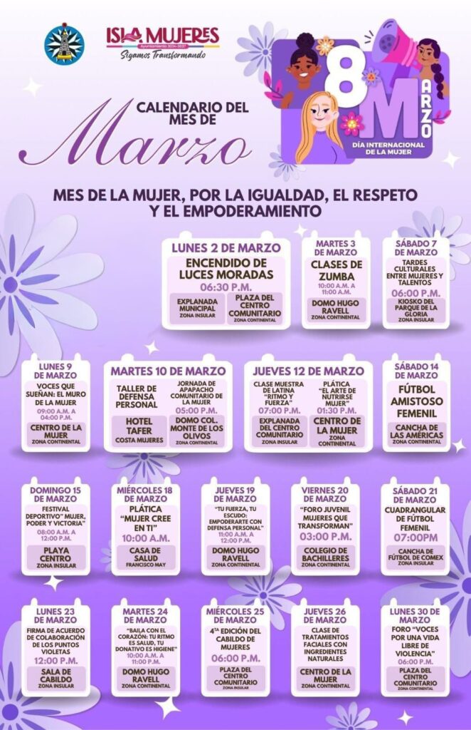 La agenda arranca este lunes 2 de marzo con el Encendido de Luces, a las 18:00 horas, en la Explanada Municipal de la Isla y en la Plaza del Centro Comunitario de la Zona Continental. Las actividades concluirán el 30 de marzo con el foro “Por una vida libre de violencia”, a las 18:00 horas, en la Plaza del Centro Comunitario, en Zona Continental.