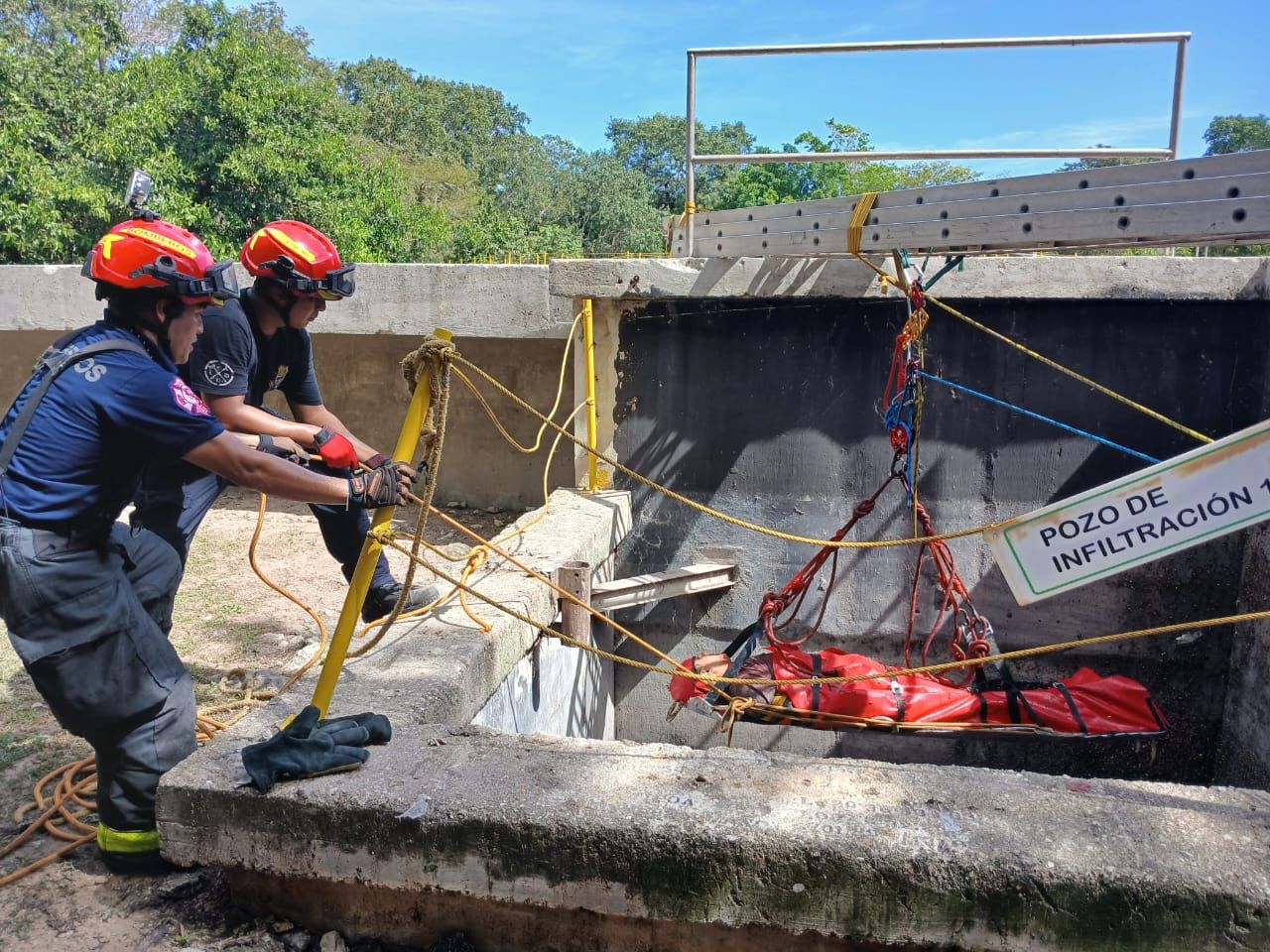 Playa del Carmen.- Un trabajador se cayó en un pozo de aguas de infiltración, en la planta de tratamiento del complejo Playacar. Bomberos se encargaron de sacarlo, para ser trasladado de urgencia, con múltiples fracturas.
