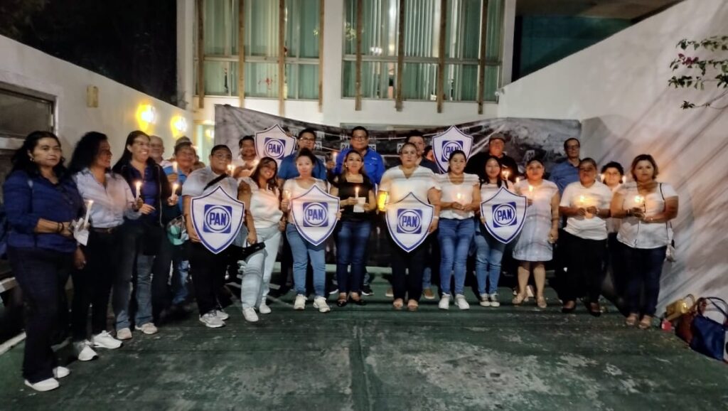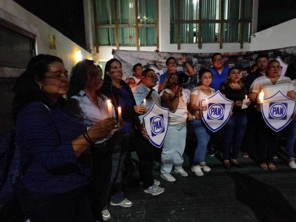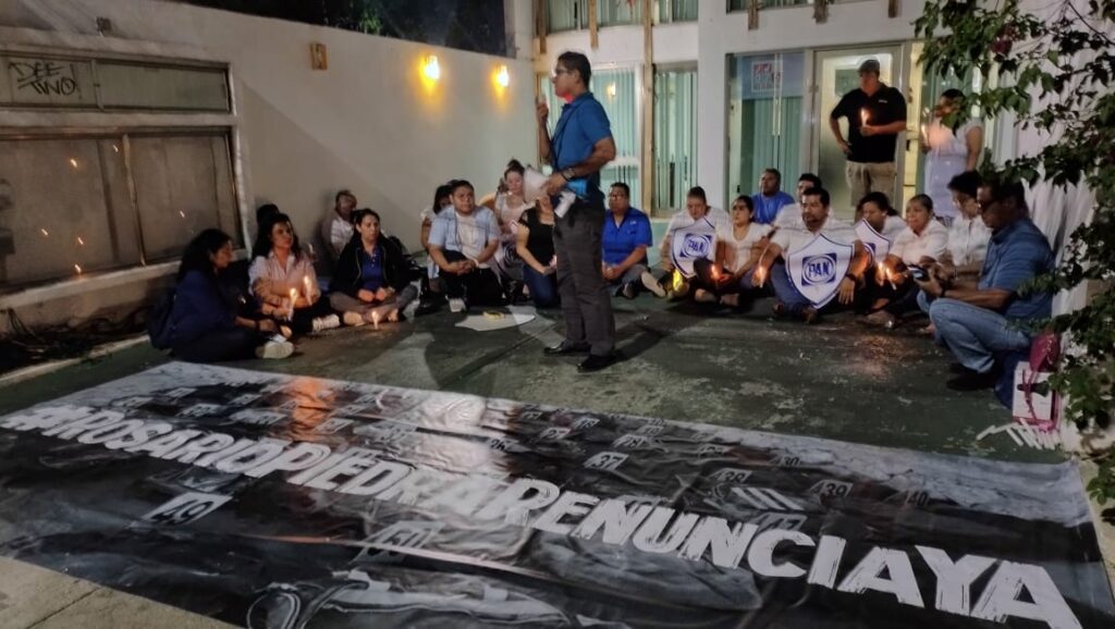 Los manifestantes se sentaron frente a la fachada de este edificio, ubicado en la avenida Xcaret, y prendieron velas, además de mostrar escudos con el logo de su partido. Frente a ellos, extendieron una lona de grandes dimensiones con la leyenda: “Rosario Piedra renuncia ya”.