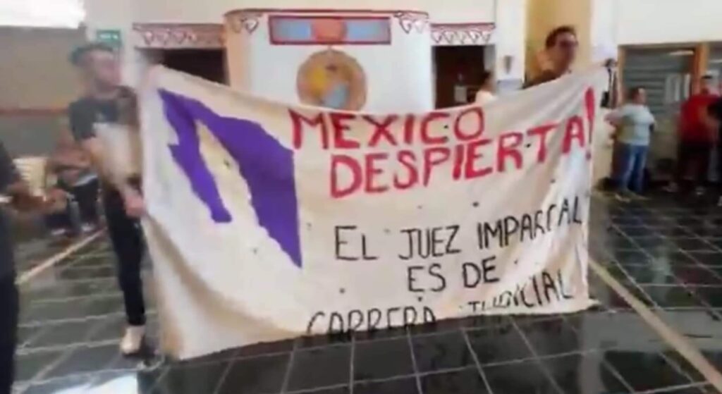La sesión fue efectuada de forma sorpresiva desde temprano, pero personal del Poder Judicial, que está en paro en oposición a esta reforma, de igual forma se enteró de que esta votación sería llevada a cabo. Por ello, los inconformes arribaron a la sede del Poder Legislativo con una gran manta, para protestar contra esta reforma constitucional.