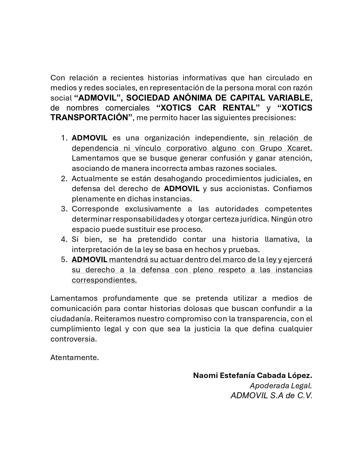 Con relación a recientes historias informativas que han circulado en medios y redes sociales, en representación de la persona moral con razón social “ADMOVIL”, SOCIEDAD ANÓNIMA DE CAPITAL VARIABLE, de nombres comerciales “XOTICS CAR RENTAL” y “XOTICS TRANSPORTACIÓN”, me permito hacer las siguientes precisiones: