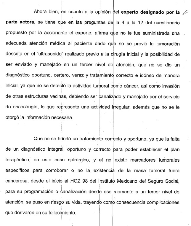 “El doctor mintió, pues le dejó el tumor adentro a mi padre y lo dio de alta a los pocos días. Lo único que hizo fue entregarnos una hoja para que le sacáramos cita con un oncólogo, para el seguimiento posoperatorio, situación que tardaría meses”, explicó ella. “Hoy sabemos que los estudios previos mostraron este tumor, pero en el IMSS, en lugar de derivar al paciente con un especialista, decidieron operar sin la debida preparación y sin enviar después a mi padre a un tercer nivel para ser atendido debidamente”.