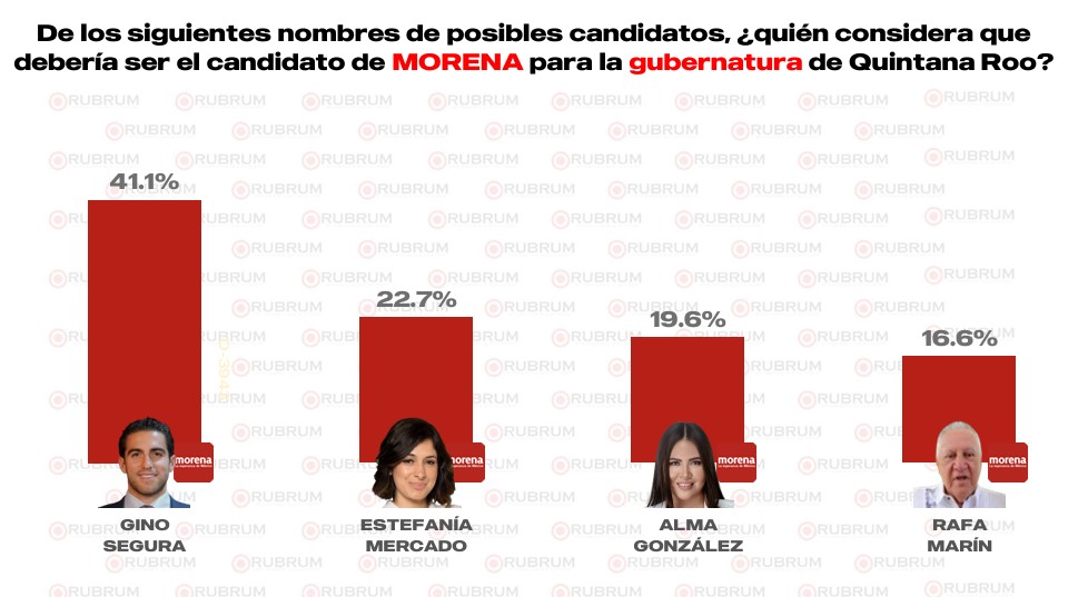 Con un 41.1% de respaldo entre los posibles aspirantes morenistas, Gino Segura se posiciona como puntero, seguido por la alcaldesa de Playa del Carmen Estefanía Mercado Asencio, quien consolida su presencia en la segunda posición con un 22.7% de intención de voto.