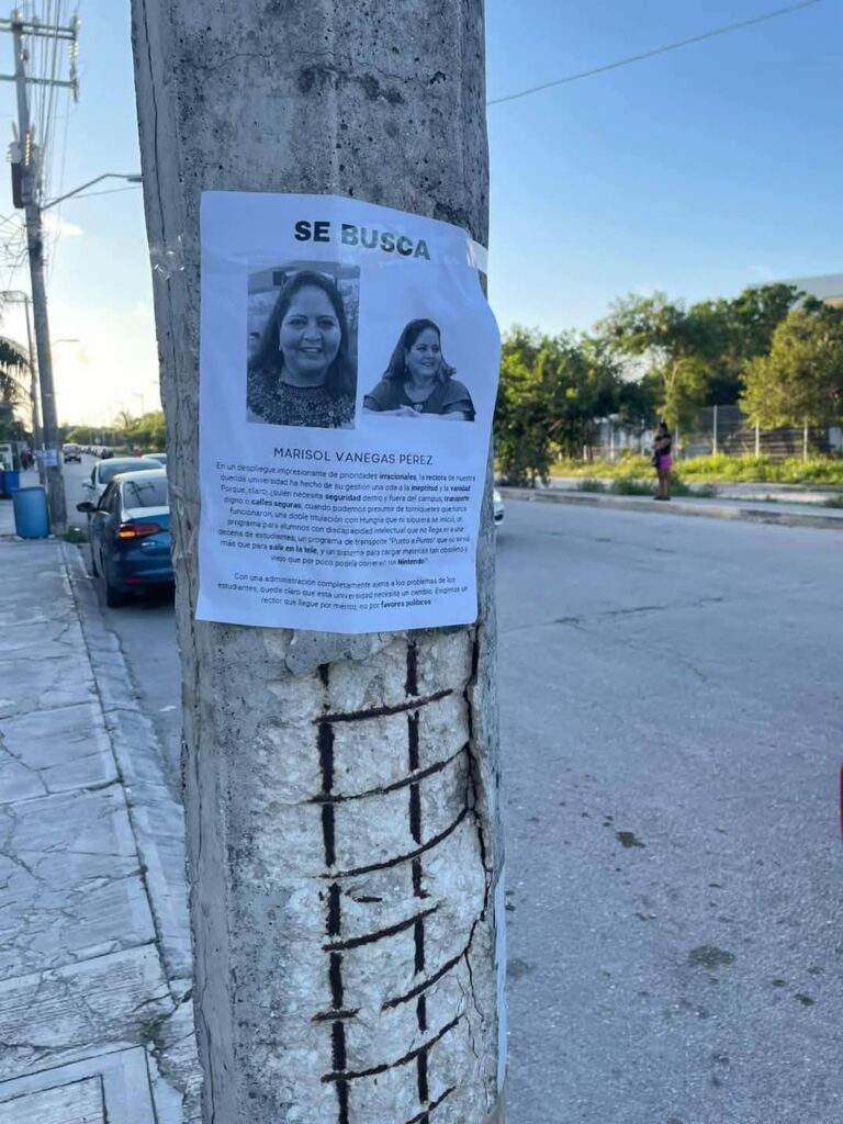 En fechas pasadas, algunos estudiantes, a modo de protesta, colocaron carteles de “Se busca” con la imagen de la rectora, a la que acusan de solo aparecer en eventos oficiales. Esta acción hizo que se reavivaran toda una serie de quejas en contra de esta universidad.