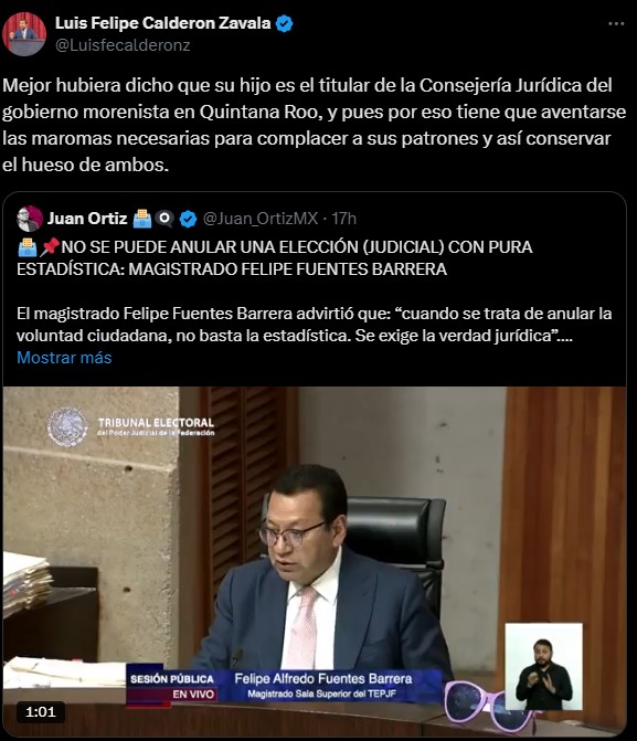 A través de una publicación de X (antes Twitter), Luis Felipe Calderón Zavala, hijo del ex mandatario, respondió a una explicación de los motivos por los que Felipe Fuentes habría rechazado el proyecto de sentencia que proponía anular la elección.