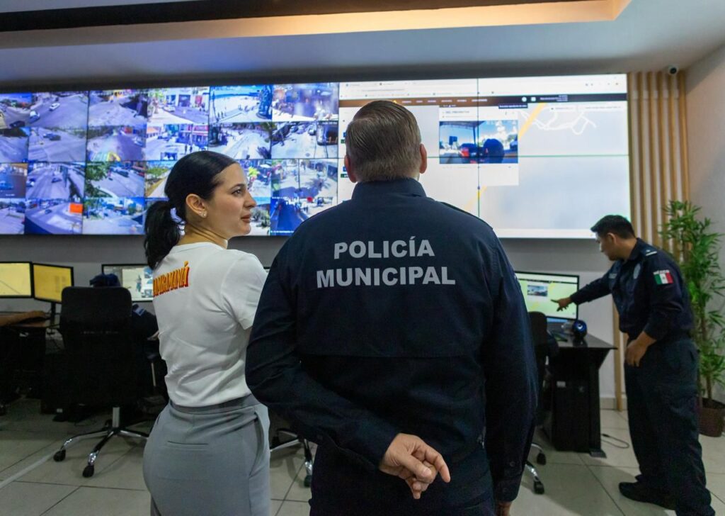Playa del Carmen, 9 de abril de 2026.— La presidenta municipal Estefanía Mercado, acompañada por el secretario de Seguridad Ciudadana Municipal (SSCM), Carlos Montesinos, realizó una visita al Centro de Control, Comando, Comunicación y Cómputo (C4), donde supervisó el funcionamiento del innovador sistema de vigilancia policial a través de cámaras corporales (bodycams).