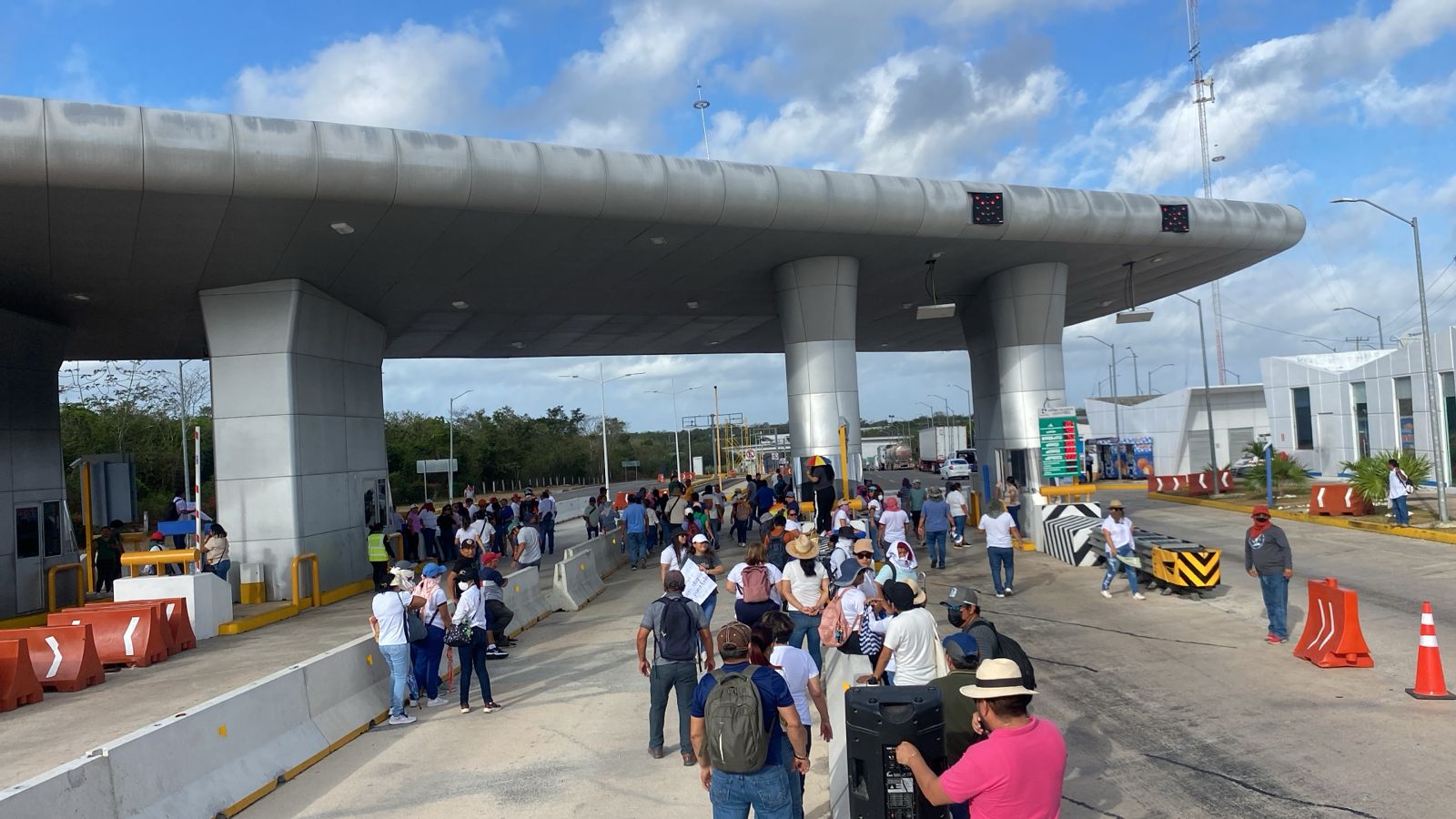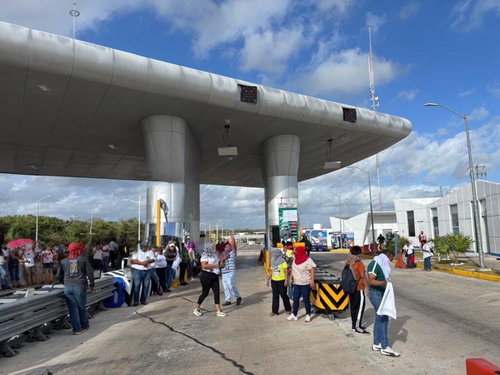 Los docentes acudieron con carteles a esta caseta, ubicada en el cruce de la carretera mencionada, con la carretera de paga Cancún-Mérida, dentro del municipio de Lázaro Cárdenas. Allí, obstruyeron estas casetas y alzaron las plumas, para que vehículos puedan pasar sin pagar.