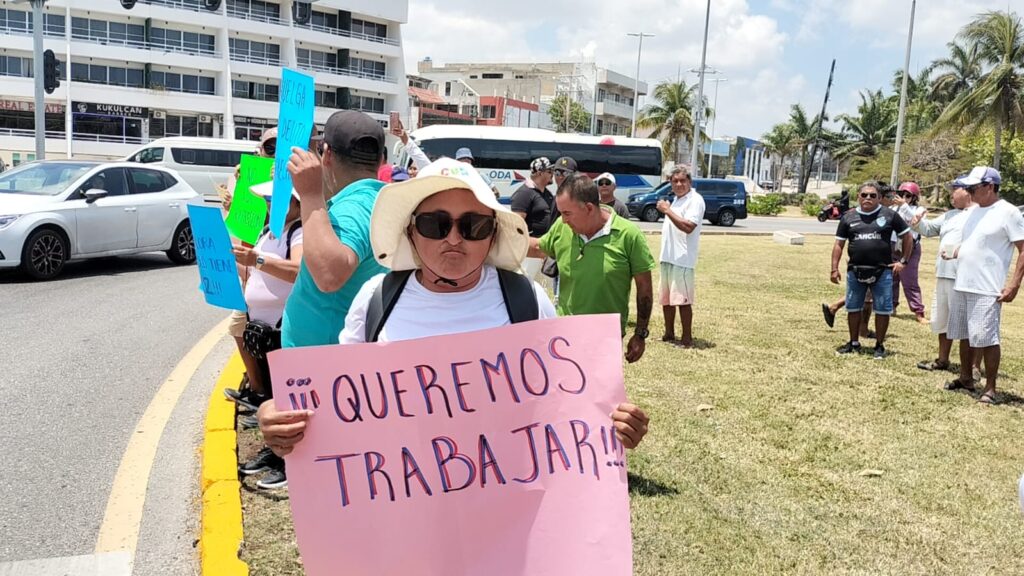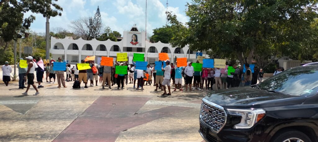 Cancún.- Un grupo de cerca de 50 comerciantes ambulantes, masajistas, acomodadores de coches y trabajadores similares de la Zona Hotelera de esta ciudad, se manifestaron de forma pacífica frente al Palacio Municipal y después marcharon hacia el Kilómetro Cero, para exigir un cese a las detenciones por parte de la Guardia Nacional, y que se les respeten los permisos que han comenzado a tramitar con el Gobierno Federal.