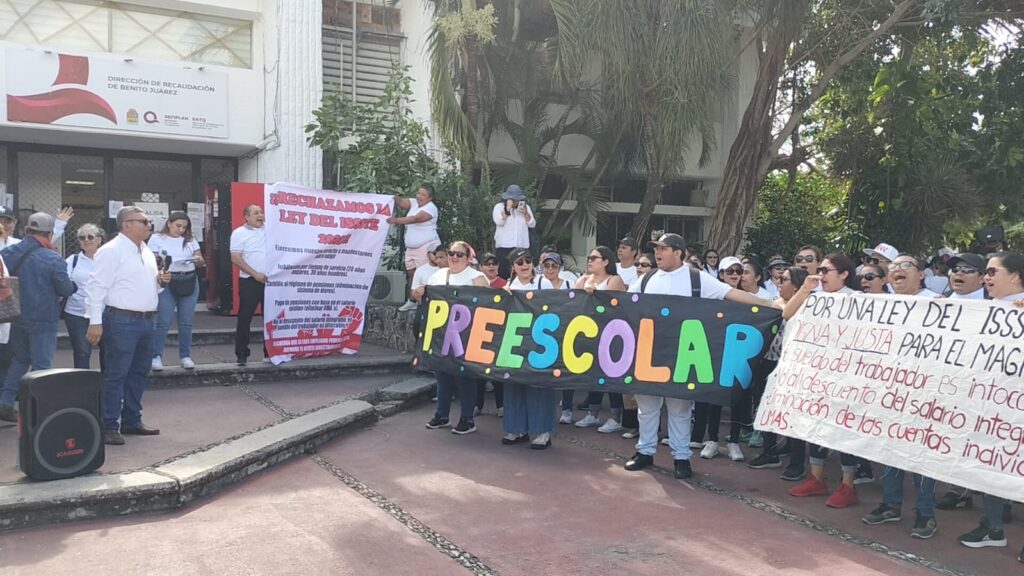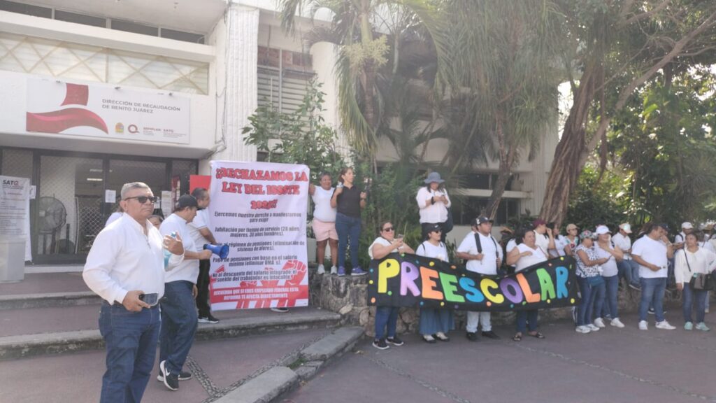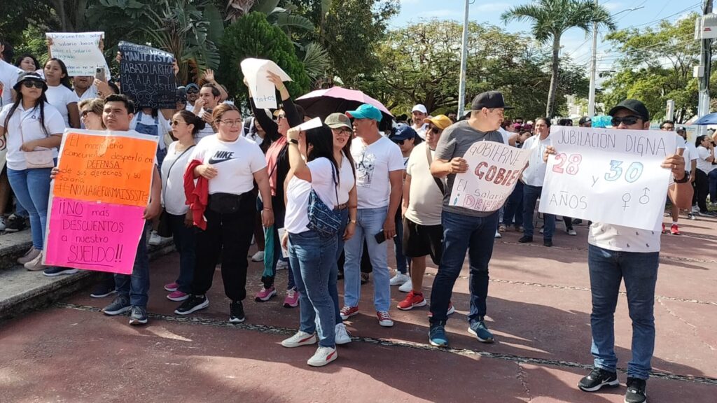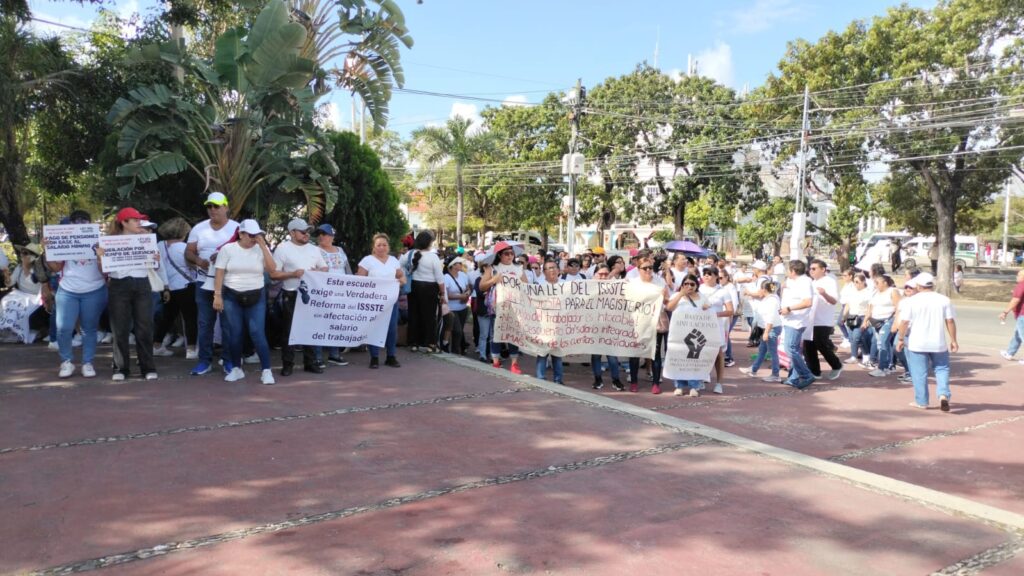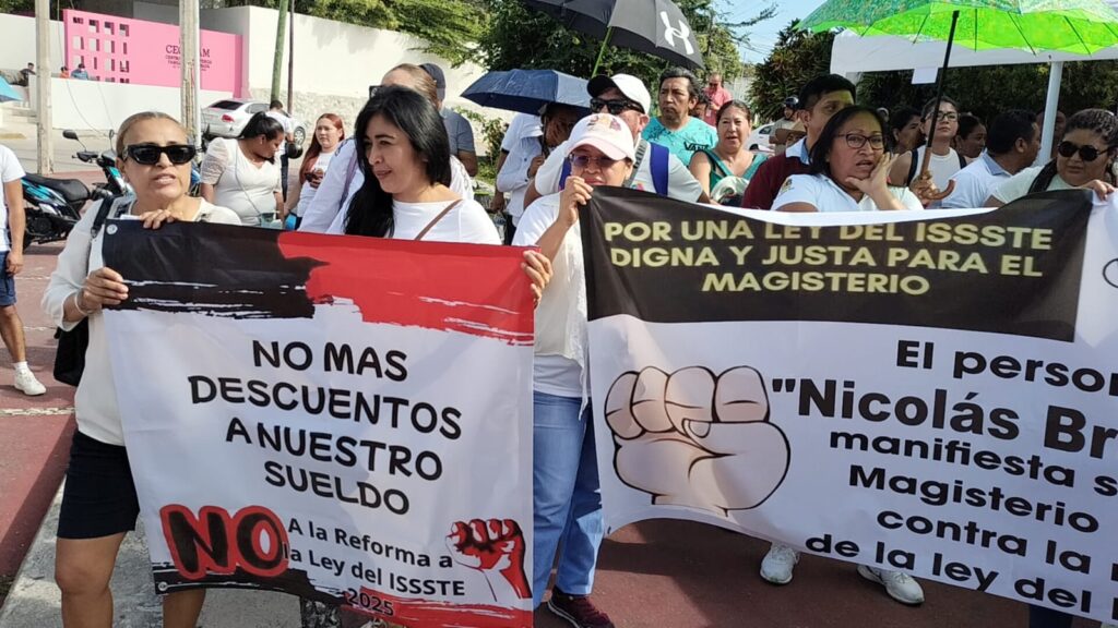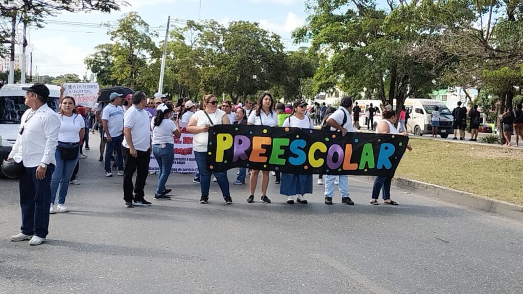 El grupo, compuesto de docentes de Cancún, Playa del Carmen, Isla Mujeres, Cozumel, Felipe Carrillo Puerto y Lázaro Cárdenas, avanzó desde el Palacio Municipal hasta el edificio del Gobierno del Estado, llevando consigo varias lonas y cartulinas con mensajes en contra de distintas disposiciones que trae esta reforma legal, además de exigencias de puntos que prometieron ser incluidos, pero que finalmente no están en la iniciativa.