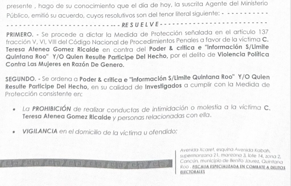 Las medidas de protección derivan de la carpeta de investigación FEMDE/06/2/2025, que lleva la Fiscalía Especializada en Combate a Delitos Electorales, en contra de dos medios de comunicación, los que han sido denunciados por conductas intimidatorias contra la edil isleña.