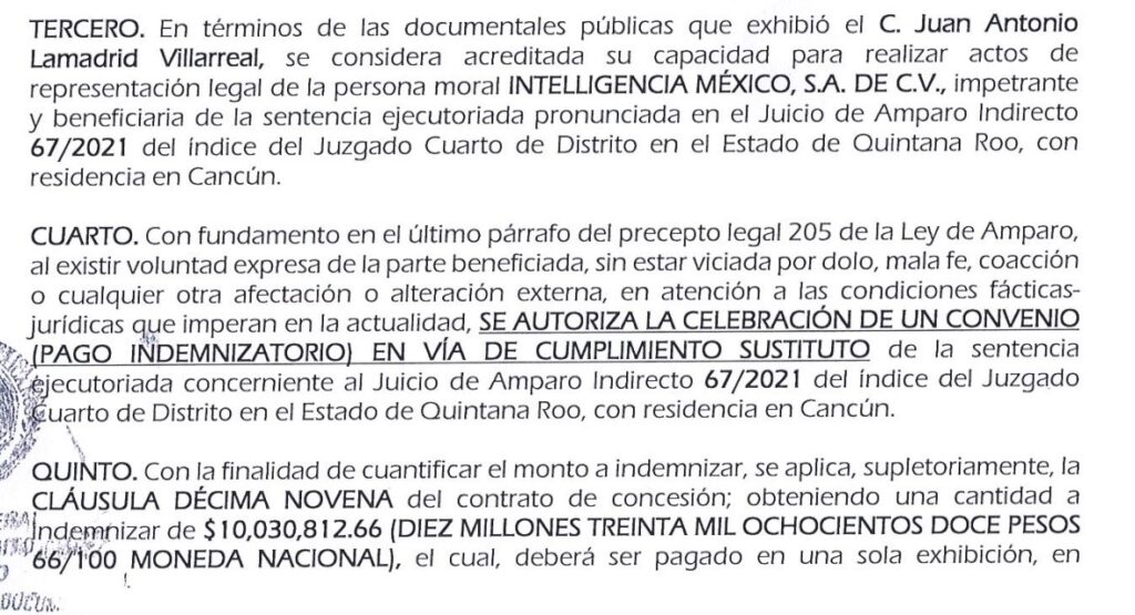 Después de tres años de litigio, en enero de 2023 un juez federal obligó al Ayuntamiento de Benito Juárez a respetar la concesión otorgada a Intelligencia México, pero un representante de la empresa, Juan Antonio Lamadrid Villarreal, señaló que la empresa no tenía condiciones materiales o financieras para retomar este servicio. Por ello, solicitó en su lugar el pago de una indemnización, por 15 millones de pesos.