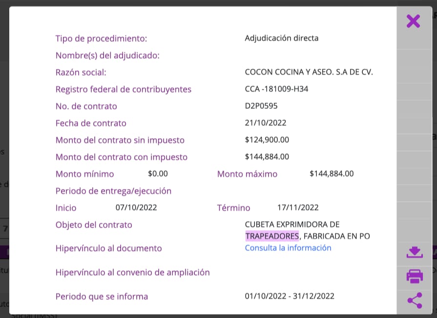De acuerdo a la Plataforma de Transparencia, el IMSS compró por adjudicación directa 224 cubetas de trapeador, por las que pagó 148 mil 884 pesos, en octubre de 2022.