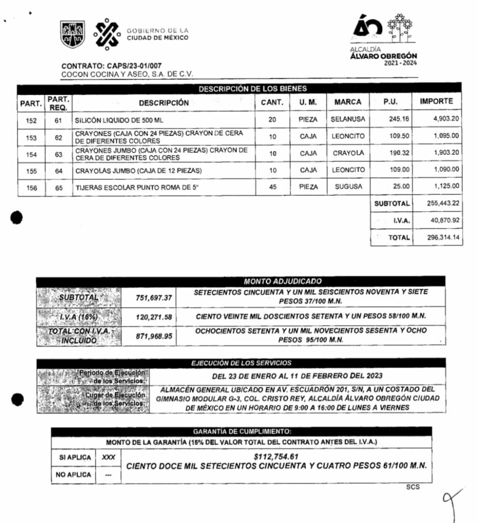 Sin embargo, Lía Limón, alcaldesa de Álvaro Obregón, le otorgó un nuevo contrato con esta empresa, por adjudicación directa. La alcaldía le entregó 871 mil 968 pesos con 95 centavos por útiles y materiales de enseñanza.