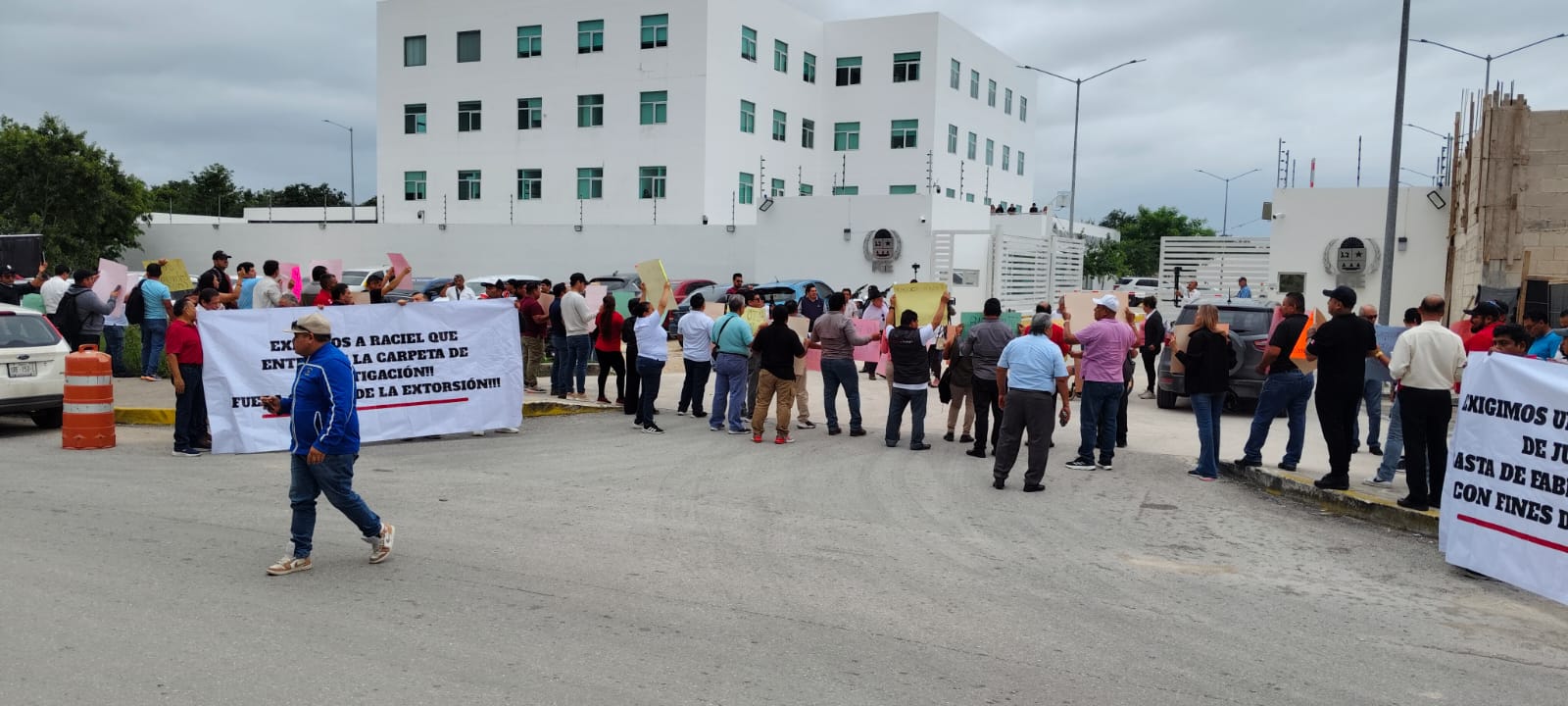 Cancún.- Un grupo de agremiados de la Confederación de Trabajadores de México (CTM) protestó de manera pacífica afuera de las instalaciones de la Fiscalía General del Estado, en la avenida Huayacán, en reacción al intento de esa autoridad de detener a su dirigente en el estado, Isidro Santamaría Casanova, dentro de una investigación por homicidio.