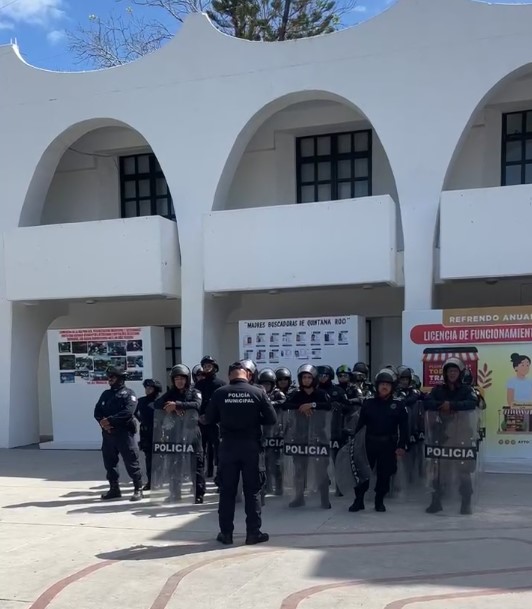 Un contingente de al menos 20 policías municipales, con equipo antimotines, se reunió afuera del Palacio Municipal, mientras esto ocurrido, junto a un número igual de elementos de la Guardia Nacional, aunque no intervinieron en esta manifestación pacífica.