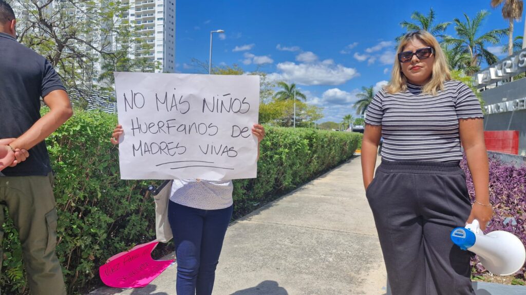 “No más niños huérfanos de madres vivas”, “Justicia para Catalina”, eran algunas de las cartulinas que llevaban estas personas, que además entregaban volantes con los detalles de este caso a quienes ingresaban a este hotel a participar en el evento.