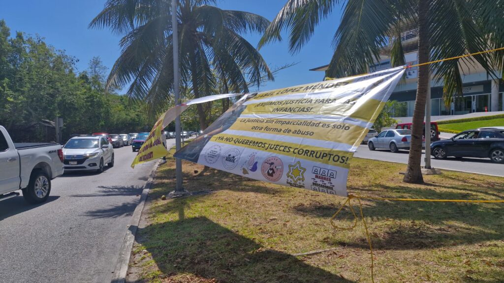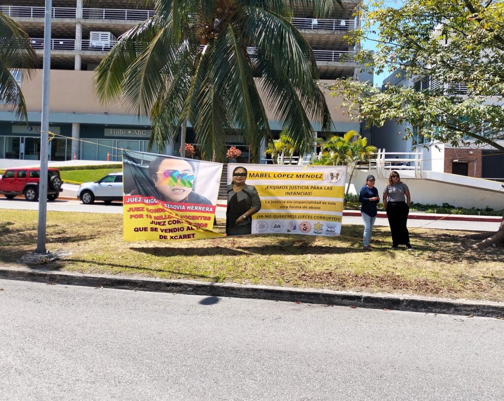 Los presentes colocaron varias lonas en el acceso al hotel y en el camellón central, en las que denuncian a Sergio León Cervantes, al igual que a integrantes del Poder Judicial por supuestos actos de corrupción, relacionado a este y a otros casos.