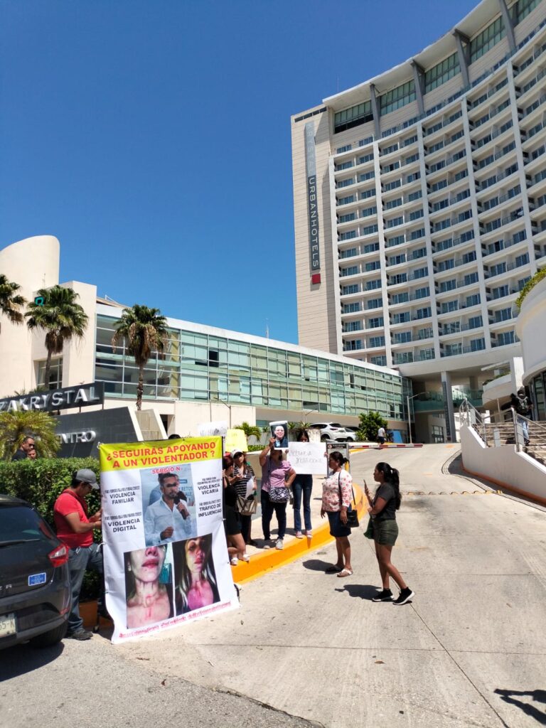 @conexionhoy Mujeres integrantes de las MadresBuscadoras de QuintanaRoo y víctimas de violencia vicaria protestan en Cancun afuera de una reunión privada entre empresarios yc andidatos ajueces, al denunciar que se busca tejer redes de influyentismo. Quien convocó a este encuentro es Sergio León Cervantes, presunto agreso de su ex pareja, a quien la privó de sus bienes y de sus hijos, con ayuda e influencia de una magistrada.