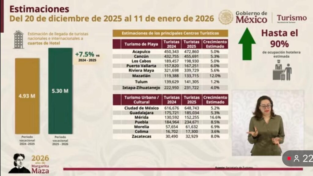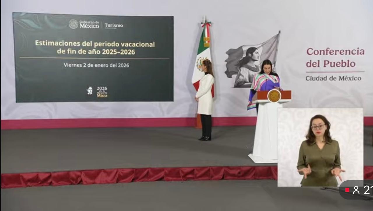 Josefina Rodríguez Zamora también presentó un balance preliminar de 2025, de enero hasta octubre (el balance hasta diciembre se tendrá en febrero), en el que señaló que México recibió a 38.4 millones de turistas extranjeros (5.8% más que en 2024), además de haber tenido a 92.6 millones de turistas nacionales alojados en hoteles.