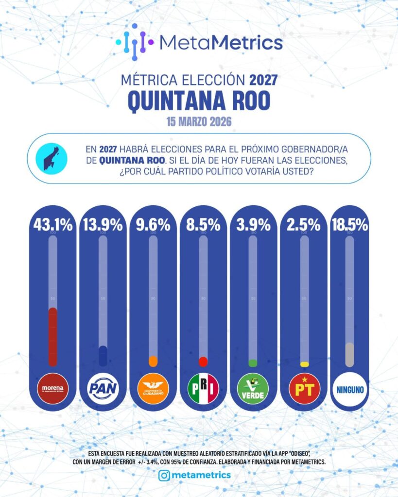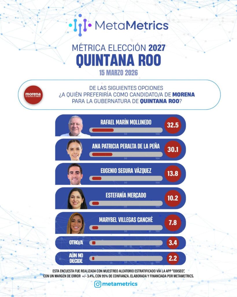Cancún, 18 de marzo de 2026.- De acuerdo con la más reciente encuesta de la firma MetaMetrics, presentada el pasado 15 de marzo de 2026, el partido Morena y Rafael Marín encabezan la intención de voto y las preferencias ciudadanas de cara al proceso electoral de 2027 en el estado de Quintana Roo.