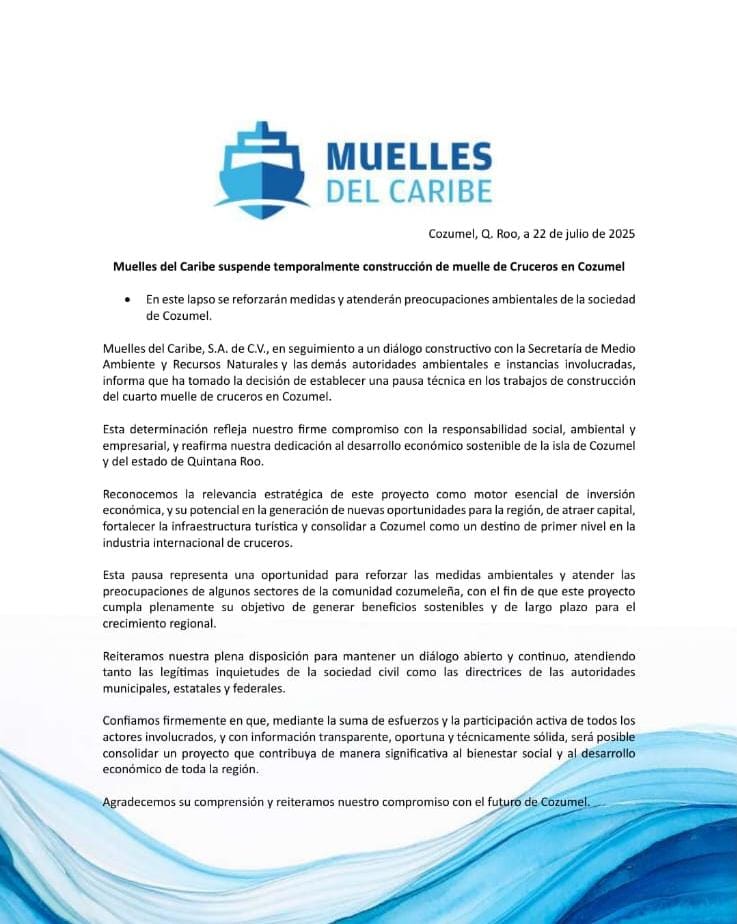 La empresa señala que mantiene su disposición a un diálogo abierto y continuo para atender las inquietudes de la sociedad civil y de las autoridades, además de confiar en que, a través de la transparencia y la suma de esfuerzos de todos los involucrados, podrá ser llevado a cabo este muelle de cruceros.