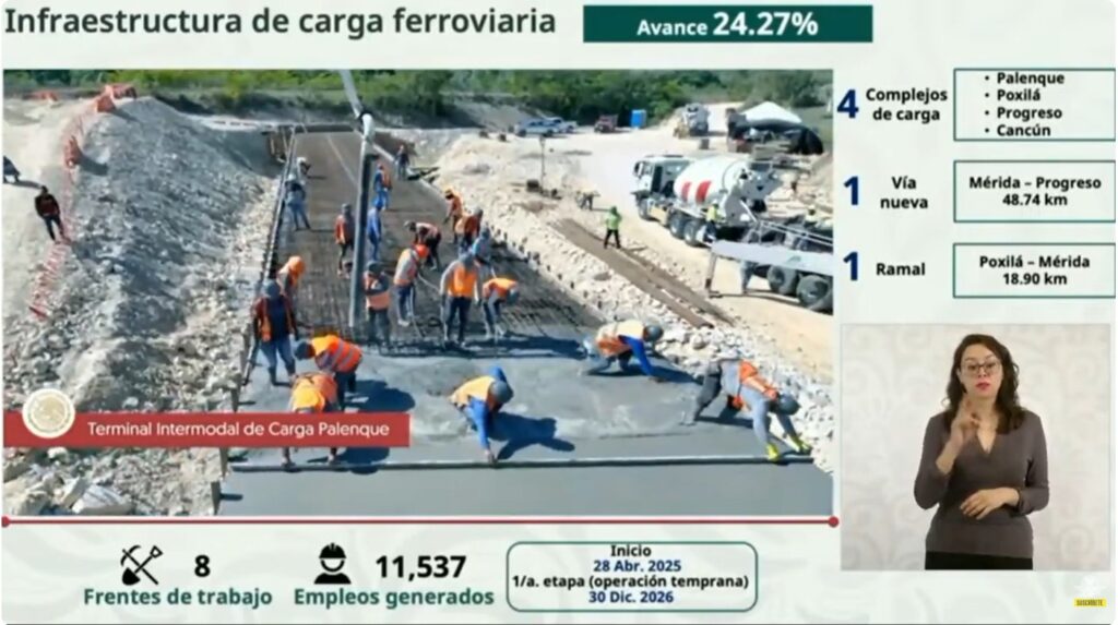 En su presentación esta mañana, en la conferencia de la presidenta Claudia Sheinbaum Pardo, el ingeniero militar detalló que la primera etapa de la construcción de la infraestructura para que este sistema de ferrocarriles traslade carga se encuentra en un 25% de avances, además de contar con todos sus permisos ambientales y con protección arqueológica.